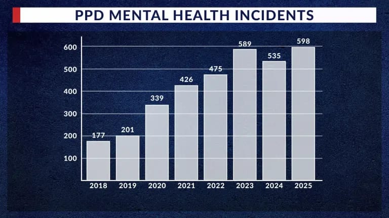 Providence police responded to a record 598 mental health incident calls in 2025, a 238% increase from 2018, driven in part by the lingering mental health effects of the COVID-19 pandemic. The department has overhauled its response through multilayered officer training, including Crisis Intervention Training, ICAT de-escalation techniques, and virtual reality crisis simulations. Since 2012, licensed clinicians from The Providence Center have been embedded in police cruisers, responding alongside officers to behavioral health calls with the goal of diverting people from unnecessary criminal justice involvement. However, the program currently has no overnight coverage, and officials say at least one additional clinician is needed to close that gap. Col. Oscar Perez credited the surge partly to increased community trust in officers, noting that residents are now more comfortable calling police for help during mental health crises.
